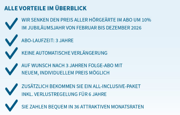 Sie profitieren doppelt: Als Dankeschön an unsere Kundinnen und Kunden senken wir im Jubiläumsjahr von Februar bis Dezember 2026 die Abo-Preise für alle Hörgeräte-Modelle – vom Einsteiger- bis zum Premiumsegment. In allen Filialen. Ohne Ausnahme.